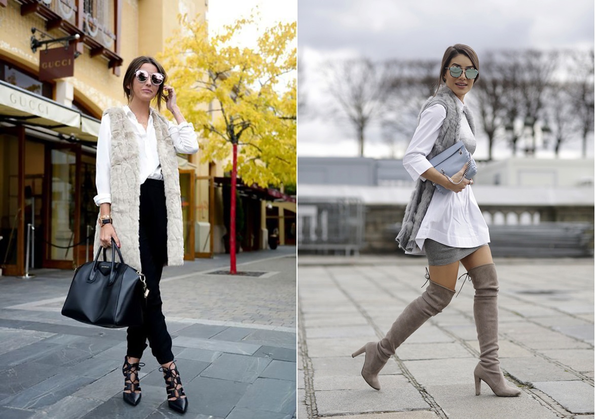 Cizmele peste genunchi sunt o piesă care a revenit vertiginos în trend anul acesta şi care poate fi combinată cu uşurinţă cu o vestă de blană. Cizmele atât de înalte vor echilibra volumul creat în partea superioară a ţinutei prin vesta de blană.